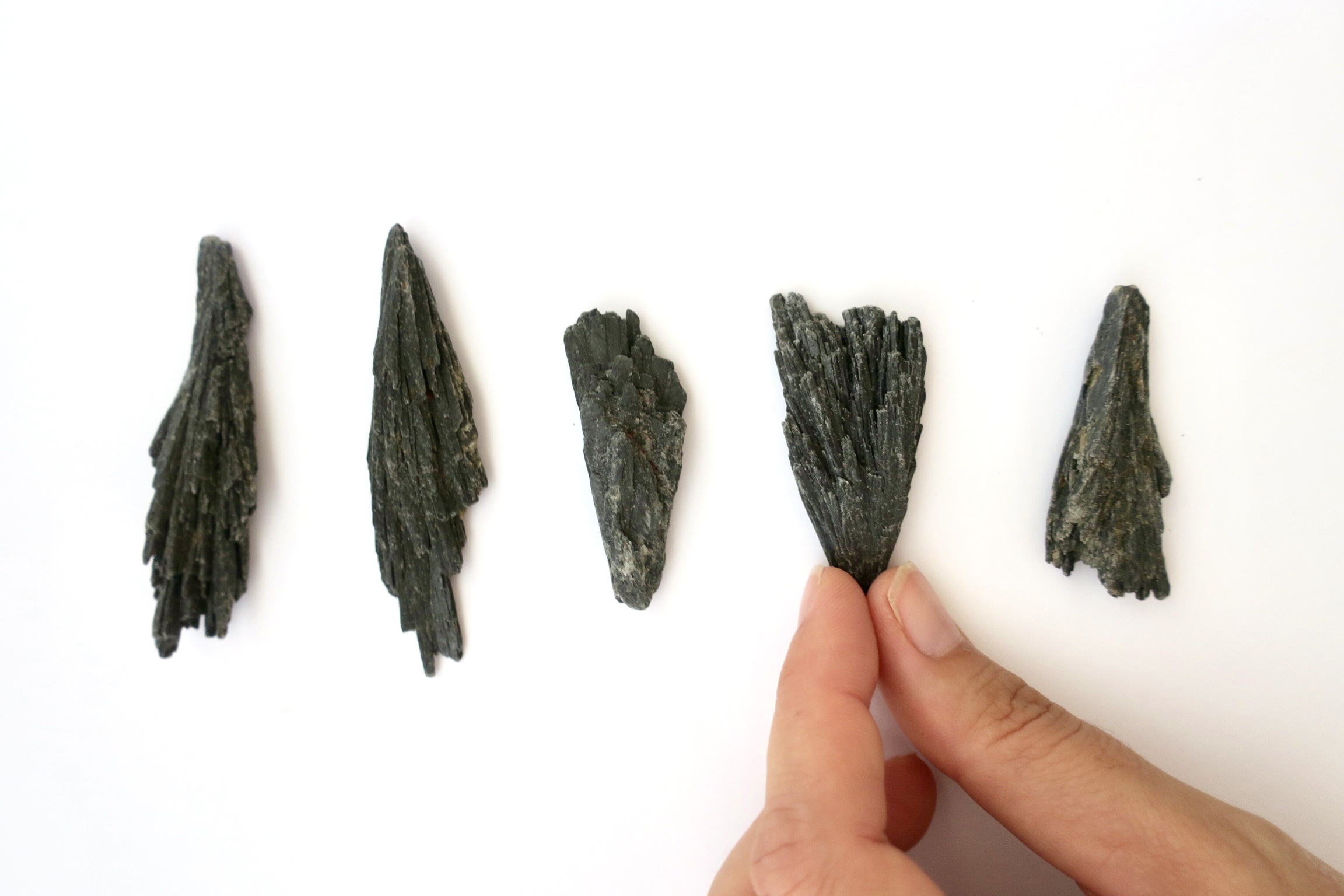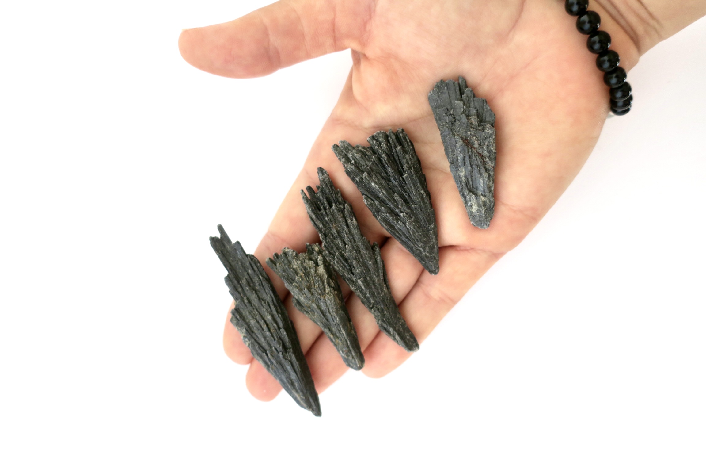 La cianita negra, también conocida como escoba de bruja, se caracteriza por su color negro brillante y su aspecto fibroso que recuerda a una escoba, de ahí su nombre común.